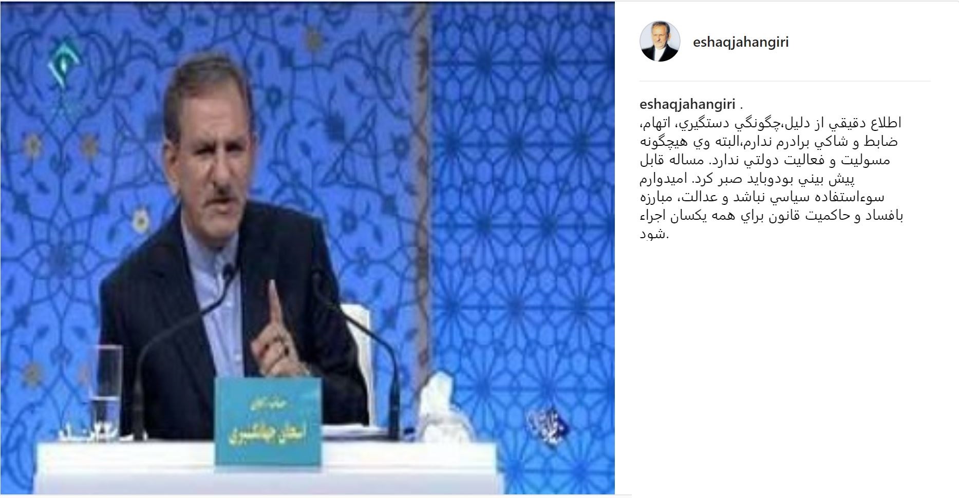 اسحاق جهانگیری در صفحه اینستاگرام خود در این مورد نوشت:«اطلاع دقیقی از دلیل،چگونگی دستگیری، اتهام، ضابط و شاکی برادرم ندارم،البته وی هیچگونه مسولیت و فعالیت دولتی ندارد.مساله قابل پیش بینی بود و باید صبر کرد. امیدوارم سوءاستفاده سیاسی نباشد و عدالت، مبارزه بافساد و حاکمیت قانون برای همه یکسان اجراء شود.»