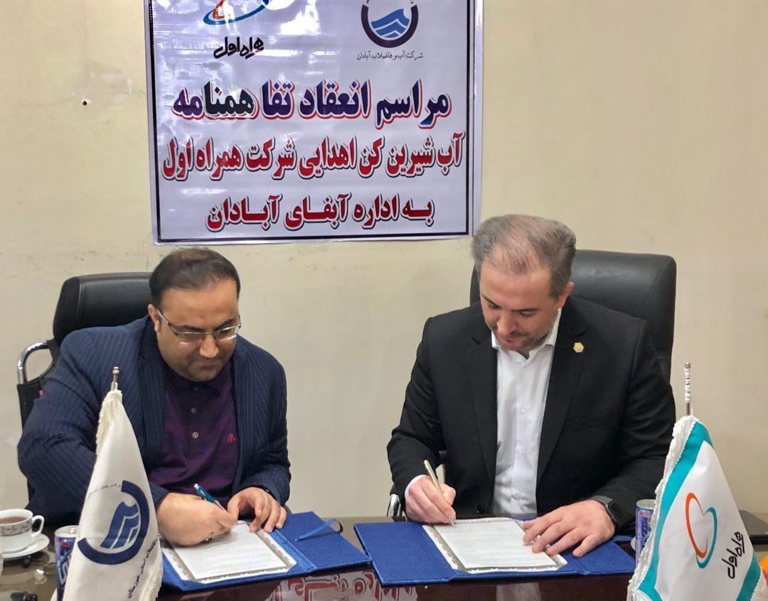 بر اساس این تفاهم نامه که به امضاء شاهین آرپناهی مدیرکل ارتباطات اپراتور اول و علیرضا خلیلی نیا رئیس اداره آب و فاضلاب شهرستان آبادان رسید، قرار است در راستای مسوولیت اجتماعی با کمک بلاعوض همراه اول یکدستگاه آب شیرین کن با ظرفیت ۳۵۰ مترمکعب در روز تهیه و جهت کمک به تأمین آب شرب به مردم شهرستان آبادان اهدا شود.