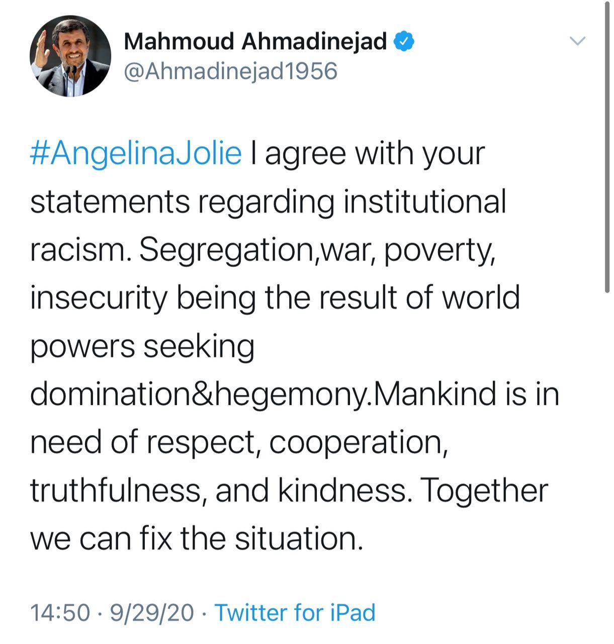 توییت احمدی نژاد خطاب به آنجلینا جولی:  با صحبت صريح شما درباره وجود تبعيض بنيادين در جهان موافقم.تبعيض ، فقر ، جنگ و نا امني محصول مديريت فعلی است .كه بر قدرت طلبی و سلطه جويی استوار است .جامعه انسانی نيازمند احترام ، صحبت ، همكاری و صداقت است. براي اصلاح وضع جهان همه با هم و متحد تلاش خواهيم كرد.