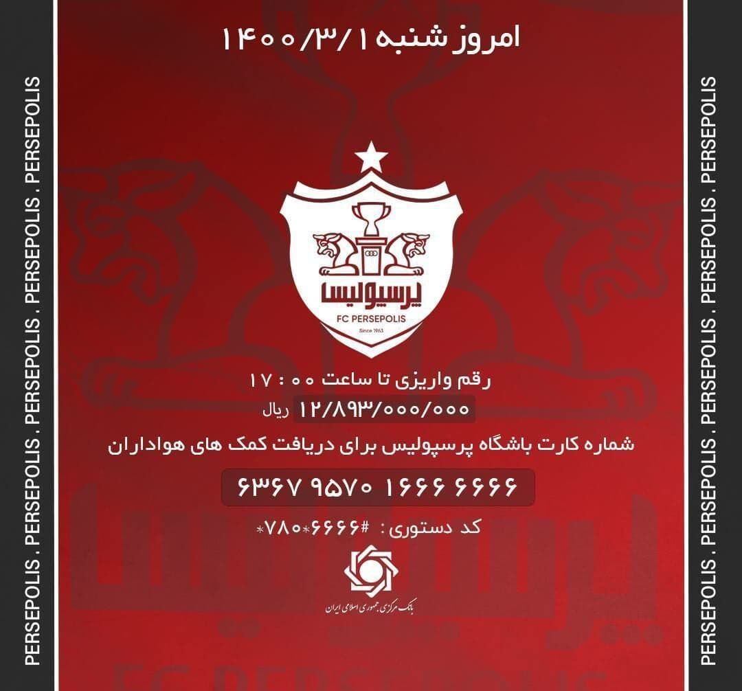 این رقم در حالی اعلام شده که هفته گذشته باشگاه پرسپولیس با انتشار بیانیهای شماره کارتی را اعلام و از هواداران این باشگاه خواست تا برای حل مشکلات، کمک مالی کنند.