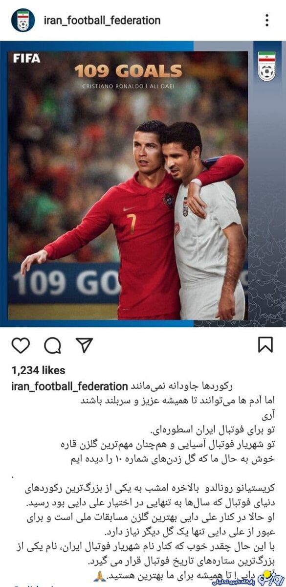 واکنش فدراسیون فوتبال ایران به برابری رکورد رونالدو با علی دایی