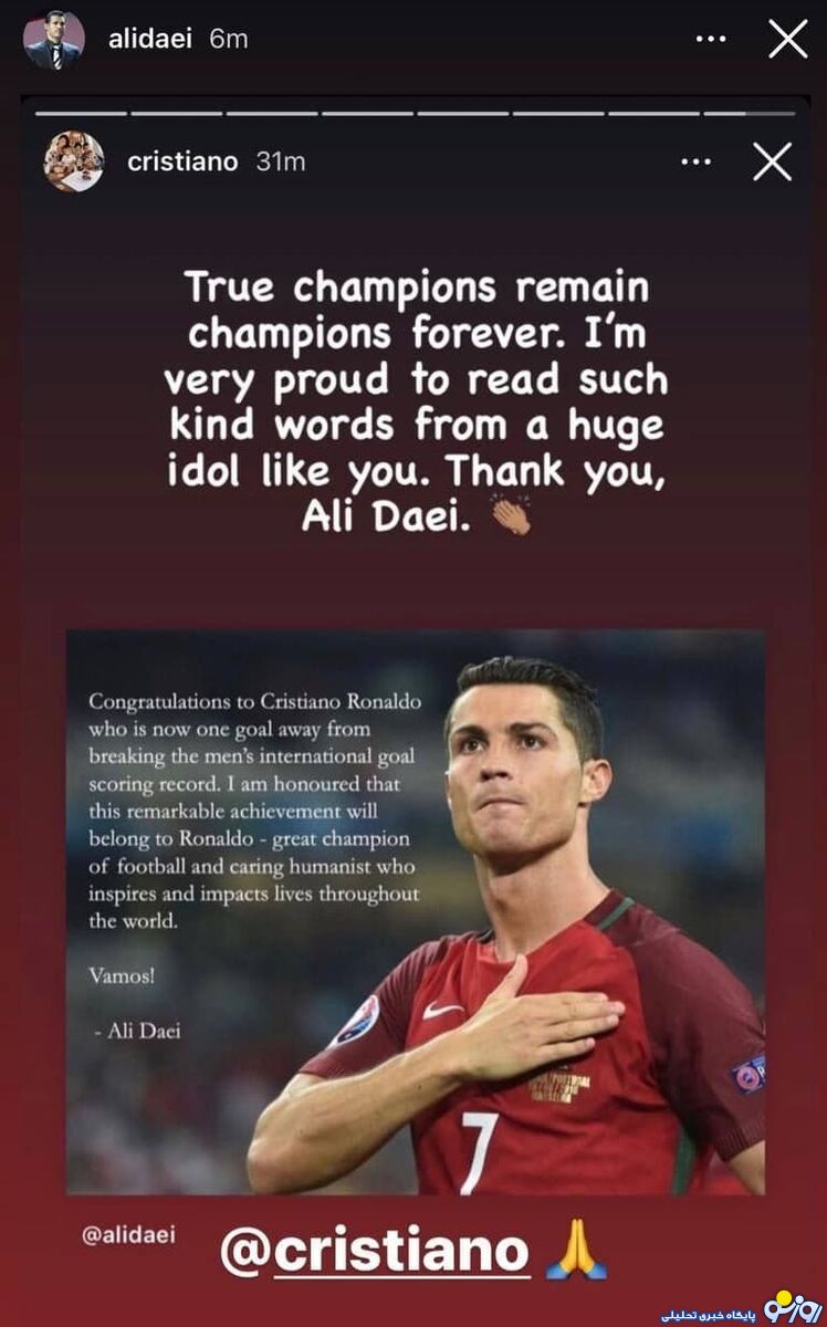 بعد از پیام رونالدو، علی دایی هم از ستاره پرتغال بخاطر پیامش تشکر کرد.