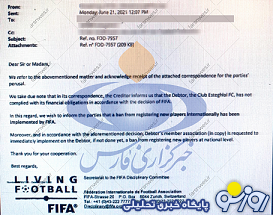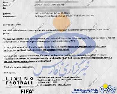 نامه ارسالی فیفا به استقلال برای محرومیت از نقل و انتقالات توسط لکیچ که ابتدای تیرماه ماه به باشگاه استقلال ارسال شده را در زیر ببینید: