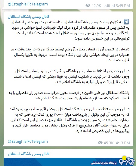 نامه دوم هم مربوط به نبوشا لکیچ است که قبلا استقلال را محکوم کرده و خبر آن (اینجا) رسانه‌ای شده بود. در آن زمان با تهدید فیفا و رسانه‌ای شدن خبر باشگاه استقلال به شکل زیر واکنش نشان داد و مدعی شد پیگیری‌ها در خصوص اختلاف حساب با این مربی ادامه دارد، اما باز هم سهل انگاری در این زمینه باعث صدور حکم پرداخت، توسط فیفا شد.