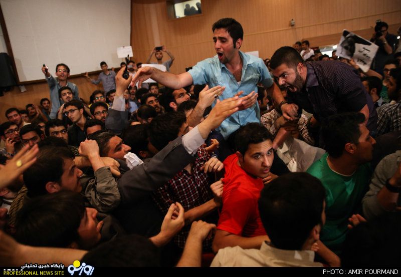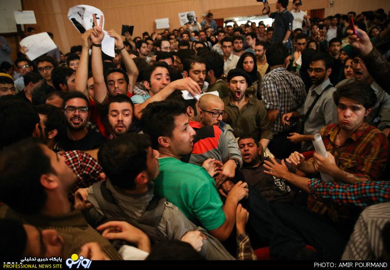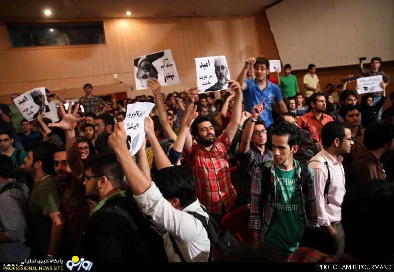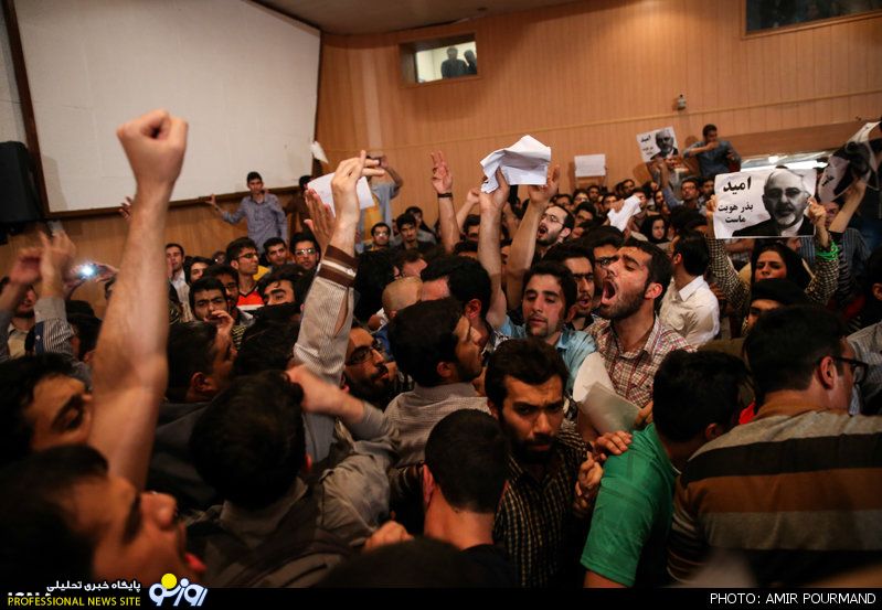 با ورود جلیلی به سالن مراسم، دانشجویان فریاد «صل‌علی محمد؛ یاور رهبر آمد» سر دادند که همزمان با این شعار دسته دیگری از دانشجویان در سالن فریاد «روحانی روحانی حمایتت می‌کنیم» و «سلام بر خاتمی درود بر روحانی» را فریاد می‌زدند.