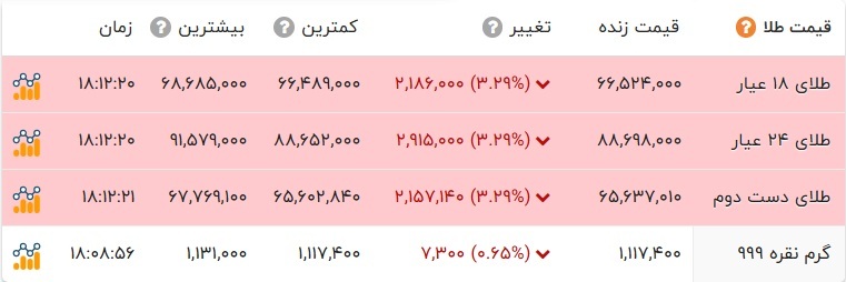 در بازار نرخ هر گرم طلای ۱۸ عیار با ۲۱۸ هزار تومان کاهش و با نرخ ۶ میلیون و ۶۵۲ هزار تومان در بازار طلا معامله شد. سکه امامی با ۲ میلیون و ۹۸۰ هزار تومان کاهش به ۷۶ میلیون و ۴۵۵ هزار تومان قیمت گذاری شد. سکه بهار آزادی با ۱ میلیون و ۹۷۵ هزار تومان کاهش به ۷۰ میلیون و ۳۰۵ هزار تومان رسید. نرخ نیم سکه و ربع سکه به ترتیب ۴۸ میلیون و ۵۶۰ هزار تومان و ۲۶ میلیون و ۷۰۰ هزار تومان در تابلو اعلان قیمتها نمایان شد.