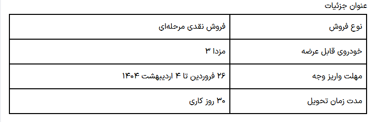 بر اساس اعلام رسمی، این طرح ویژه شامل خودروی مزدا ۳ بوده و ثبت‌نام به صورت فروش نقدی مرحله‌ای و با قیمت غیرقطعی انجام خواهد شد. جزئیات مربوط به نحوه واریز وجه و زمان‌بندی مرتبط در ادامه ذکر شده است.