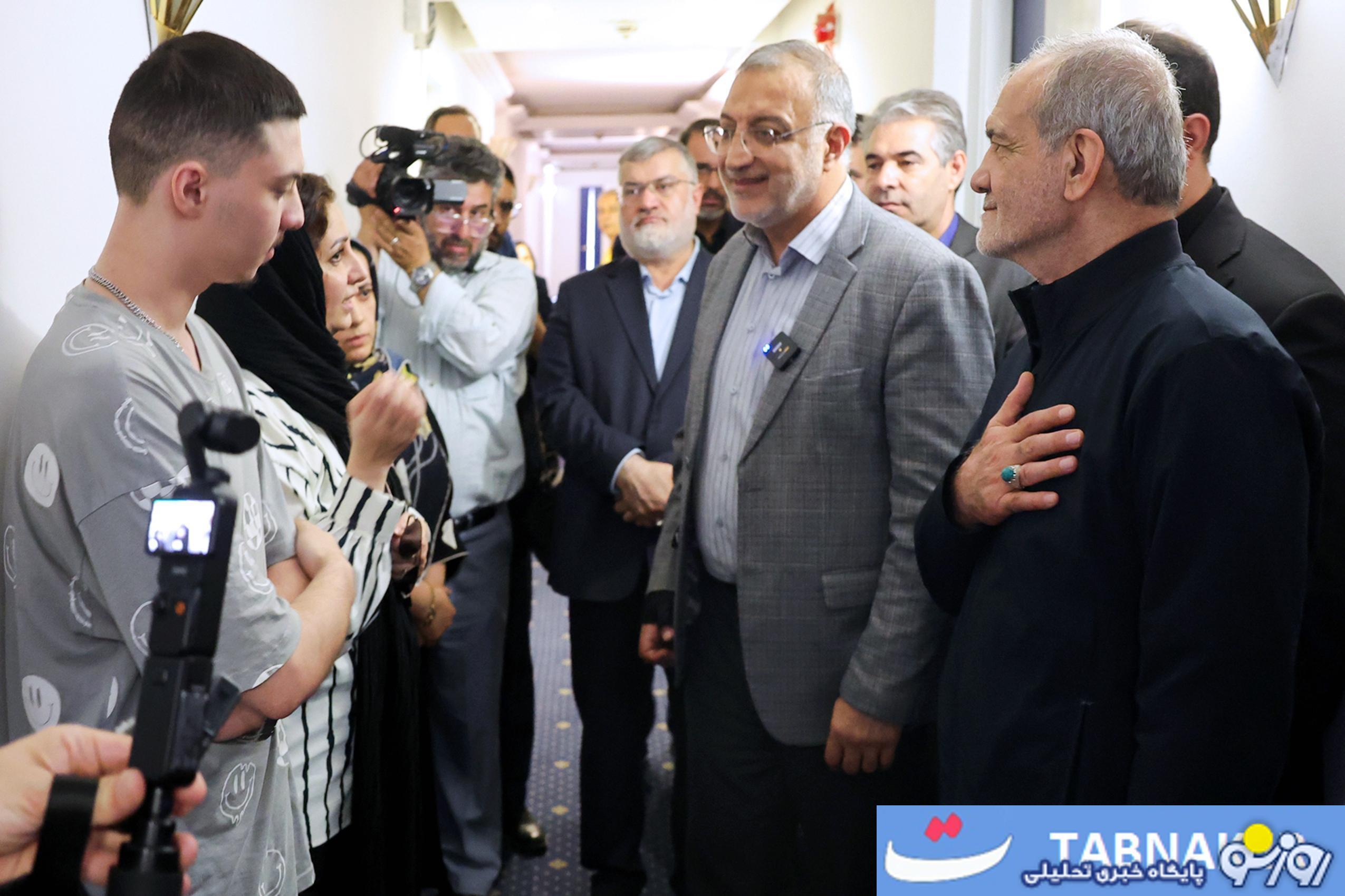 دکتر مسعود پزشکیان رئیس جمهور به همراه دکتر علیرضا زاکانی شهردار تهران ظهر دوشنبه با حضور در یکی از هتل‌های شهر تهران با جمعی از خانواده‌های آسیب دیده از جنگ ۱۲ روزه دیدار و گفت‌و‌گو کرد.
